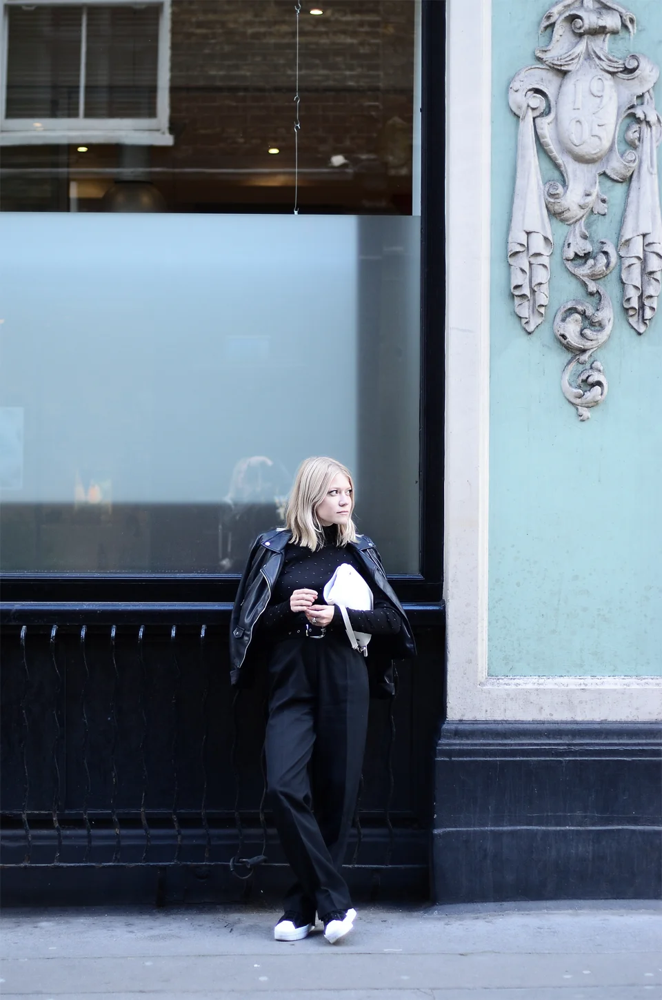 Wearing old pants from my mom's closet, beaded turtleneck by H&M, 'Superstar' sneakers by Adidas Originals (via Zoot), leather jacket by Zara and travel folio by AM.SQUARE (available in LAB24).